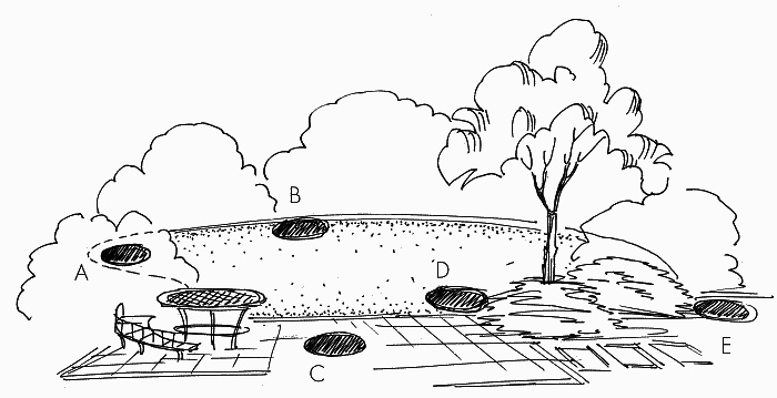 Известно, что место в саду для детей должно быть расположено недалеко от места отдыха взрослых, ну или как минимум в пределах видимости. На рисунке дана ситуация (площадка отдыха, место отдыха, лужайка, миксбордер, посадки деревьев и кустарников) и варианты расположения места для детских игр (A E). A скрыто от места отдыха кустарником; B удалено от площадки отдыха; C оказывается в транзитной зоне; E слишком «оторвано» от площадки. Оптимальным оказывается место D, часть которого к тому же еще и притенена деревом.