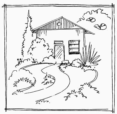 Допустим, мы решили, что площадка должна располагаться не у стены дома, а у забора. Выбор места может быть продиктован соседскими постройками, которые будут видны с площадки. Например, напротив нашего участка стоит неказистый домик, и мы подсознательно отодвигаемся от него, перенося площадку подальше. Но в итоге, отдыхая на позиции «подальше», мы подолгу созерцаем именно этот малопривлекательный дом, который все время находится в поле нашего зрения. Подумайте о том, чтобы, наоборот, расположить площадку отдыха максимально близко к соседскому дому практически под его забором. Тогда вы будете сидеть к нему спиной и любоваться своим домом. Хороший вид с площадки отдыха на собственный дом важен это привносит ощущение комфорта и уверенности. Менее удачен вариант, когда дом стоит прямо напротив беседки, являющейся местом отдыха, и соединяющая их прямая линия «разрезает» пополам сам сад и плоскость газона. Выбирая место для площадки отдыха, нужно обязательно чувствовать дом. И если вы его не видите, сидя вплотную, то должны хотя бы чувствовать, опираясь спиной о его теплую стену. Естественно, нужно учитывать в расположении площадки все те факторы, которые определили на одном из предыдущих этапов (скажем, постоянный шум, неприятный запах и пр.).
