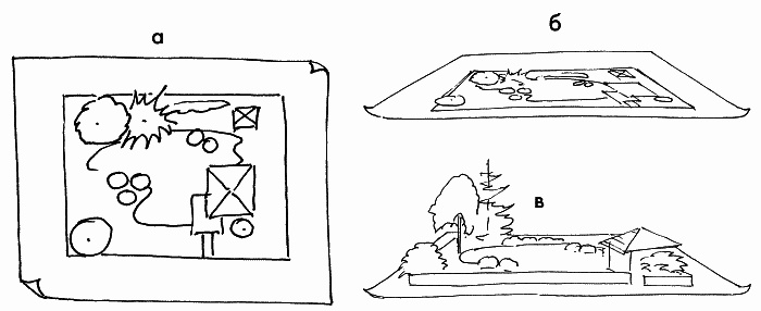 Если вам трудно представить, как распределены объемы на проектируемом участке, то можно сделать следующее: возьмите план (рисунока) и сфотографируйте его, но не фронтально, а под углом (рисунокб), а потом, распечатав данную фотографию, «поднимите» объемы (рисунокв).