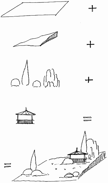 На рисунке наглядно показано, из чего складывается объемно-пространственная структура сада. Это собственно плоскость-основание, рельеф, растительные объемы и архитектурные формы. Все это вместе в разных комбинациях дает величайшее множество вариантов, и в процессе их формирования желательно уже в той или иной мере представлять результат, который мы хотели бы получить.