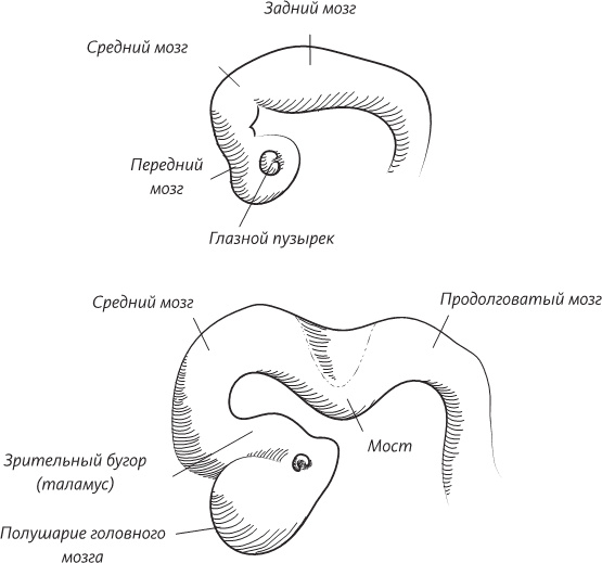 На четвертой неделе внутриутробного развития новообразованная нервная трубка, слегка расширенная на переднем конце, разительно напоминает нервную трубку примитивного хордового животного, такого, как ныне живущие ланцетники или древние вымершие хайкоуэллы. Человеческому мозгу предстоит еще долгий путь дальнейшего развития, а мозг ланцетника у взрослого животного представляет собой именно легкое расширение на переднем конце нервной трубки и едва ли превосходит сложностью спинной мозг. У позвоночных, включая и нас, более сложный мозг начинает формироваться уже в эмбриональном периоде; передний конец слепо заканчивающейся нервной трубки расширяется, образуя три соединенных между собой пузыря, из которых развиваются передний мозг, средний мозг и задний мозг соответственно. Развитие заднего мозга контролируется генами семейства Hox, определяющими план строения тела у многоклеточных. Эти гены имеют очень древнее происхождение варианты этого гена присутствуют у плодовой мушки, а наш общий с ней предок жил около 800 миллионов лет назад. Области переднего и среднего мозга формируются под влиянием более молодых генов, которые возникли после эволюционного расхождения первично- и вторичноротых, но перед возникновением хордовых животных.