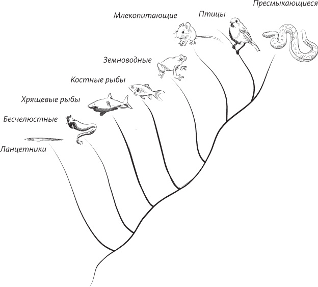 Филогенетическое древо (самые ранние предки в нижней части рисунка) позвоночных, их ближайших сородичей бесчелюстных (включая миног) и более отдаленных родственников ланцетников