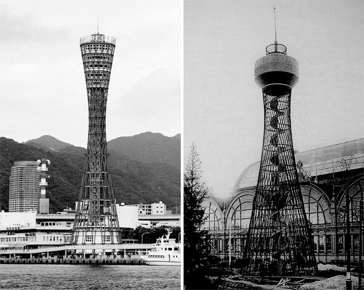 Слева Башня порта Кобэ (арх. бюро Nikken Sekkei), справа водонапорная башня на выставке в Нижнем Новгороде (арх. В.Г. Шухов)