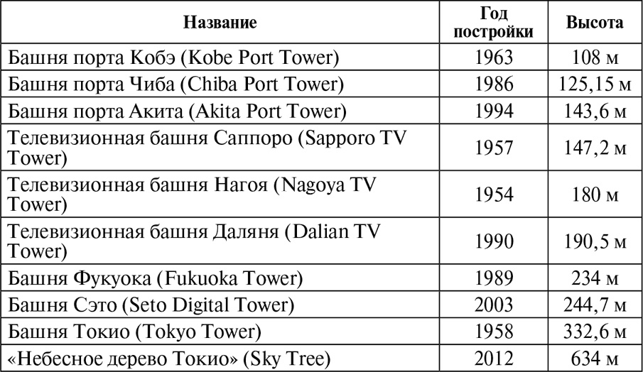 В конце 1950-х гг., во время сильнейшего взлета экономики Японии, страна нуждалась в мощном символе этого феномена. С другой стороны, в условиях коммуникационного бума назрела необходимость возвести мощную передающую вышку. Телевизионная башня Токио (арх. Т. Найто, арх. бюро Nikken Sekkei, см. вкл.: илл.50), построенная в 1958 г., получила высоту почти 333 м, что превысило высоту Эйфелевой башни и позволило Tokyo Tower стать самой высокой металлической конструкцией в мире.