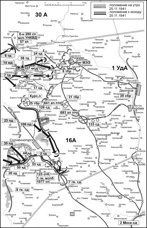 Доложив о том, что участок Дмитров, Яхрома к вечеру 27 ноября будет занят и подготовлен для обороны частями 29-й стрелковой бригады, я одновременно высказал свои опасения, что переход армии в наступление до полного сосредоточения без танков и достаточного количества артиллерии может привести к поражению ее по частям и не только не улучшит, а, возможно, ухудшит общее положение на правом фланге Западного фронта. Однако Главком все же потребовал оказать помощь Захарову и предложил самостоятельно решить вопрос о выделении сил и средств для выполнения этой задачи; срок начала наступления был назначен на 2728 ноября»[82].