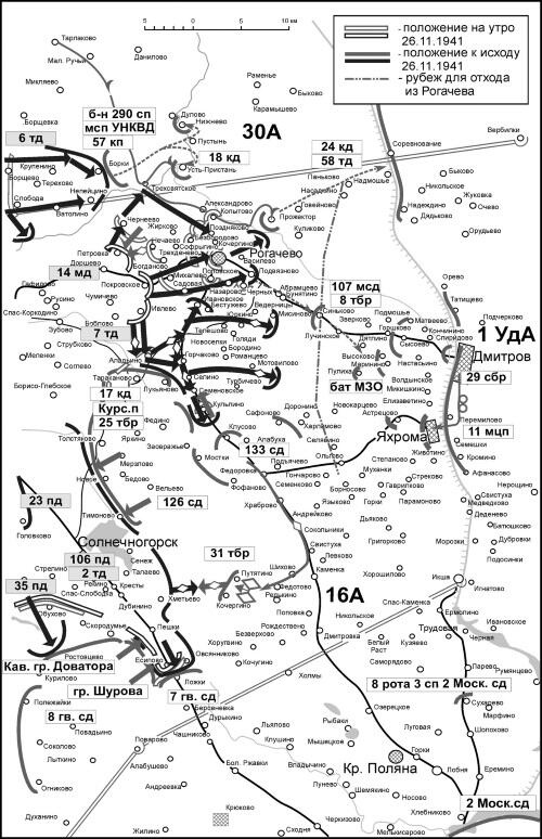 Пытаясь задержать противника на промежуточных рубежах, 30-я А старалась изыскать и силы для занятия рубежа канала Москва Волга. Согласно записи в журнале боевых действий Западного фронта в Дмитров был отведен 923-й сп, а в Яхрому направлен 11-й мцп[112]. Кроме того, в своих мемуарах Г. И. Хетагуров[113] утверждает, что часть левофланговой группы он направил для занятия тылового рубежа на линии Паньково, Синьково, Ольгово. Но в действительности состав войск под Рогачево не изменился. Об этом можно говорить с полной уверенностью, поскольку новый командир группы начал свою деятельность с разработки подробного плана обороны села, в котором перечислены те же соединения, что вели бои 25 ноября[114].