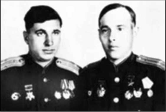 Летчики, бомбившие переправы под Яхромой. Штурман С.П. Чугуев и командир экипажа П.П. Глазков.