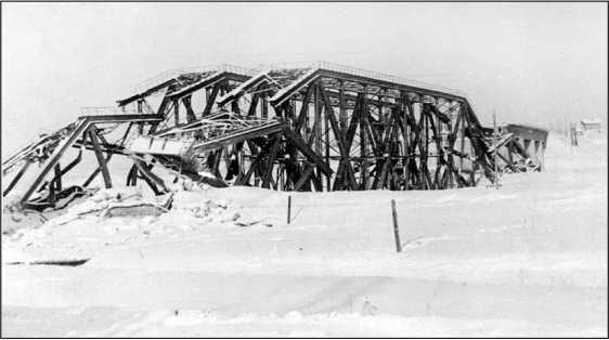 Взорванный железнодорожный мост через канал в районе Деденева.