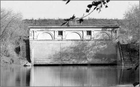Место, где р. Сестра протекает под каналом. На противоположной стороне зимой 1941 г. были установлены конструкции, перекрывшие водный поток.