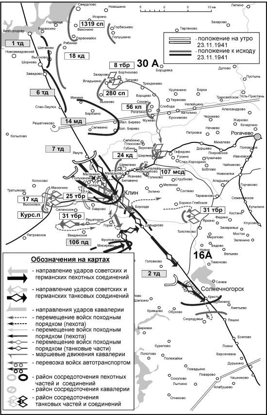 В те часы, когда В. И. Кузнецов инспектировал оборонительные рубежи вдоль канала Москва Волга, командующий 16-й А К. К. Рокоссовский находился в пятидесяти километрах от него, в Клину. Он тоже оказался в отрыве от штаба на правом фланге армии. В отличие от своего коллеги Кузнецова, Рокоссовский располагал реальными полками и дивизиями. Но его положение было в чем-то похожим. Части и соединения 16-й армии уже более недели вели тяжелые бои по всему фронту, отходили на восток и понесли к тому моменту большие потери. Свободными резервами армия не располагала, и в руках командующего не было инструмента, с помощью которого он мог изменить ход борьбы в свою пользу.