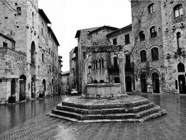 Под осенним дождем не посидишь на площади, да и столики убраны, но дочиста отмытые камни заставляют пьяццу сиять, словно бриллиант, чего не увидишь жарким летом, а скоро включатся рождественские гирлянды и зажгутся вот только бы кончился дождь! факелы в старых держателях Кажется, что башни склонились над площадью, баюкая ее в ладонях, словно чашу.
