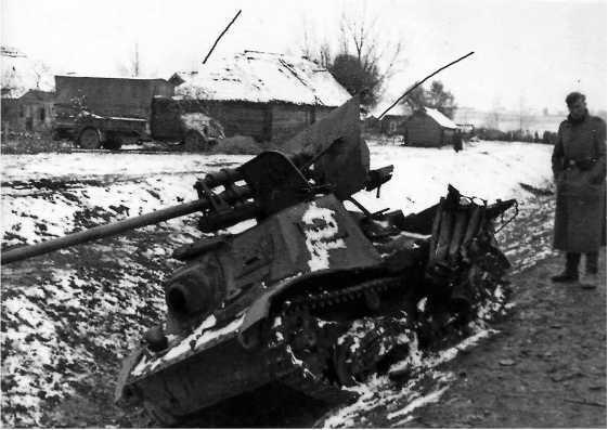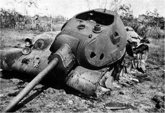 Т-34, подбитый в районе Можайска. Судя по размеру пробоин, танк стал жертвой 88-мм зенитки