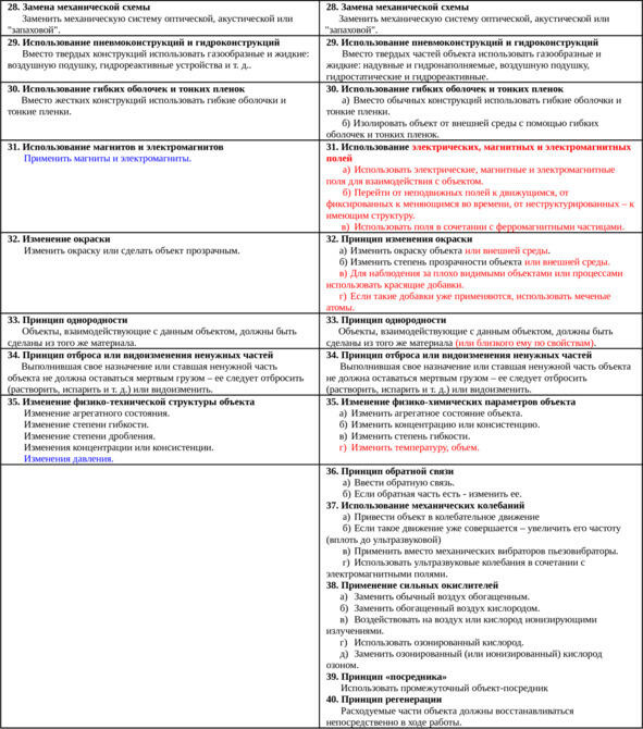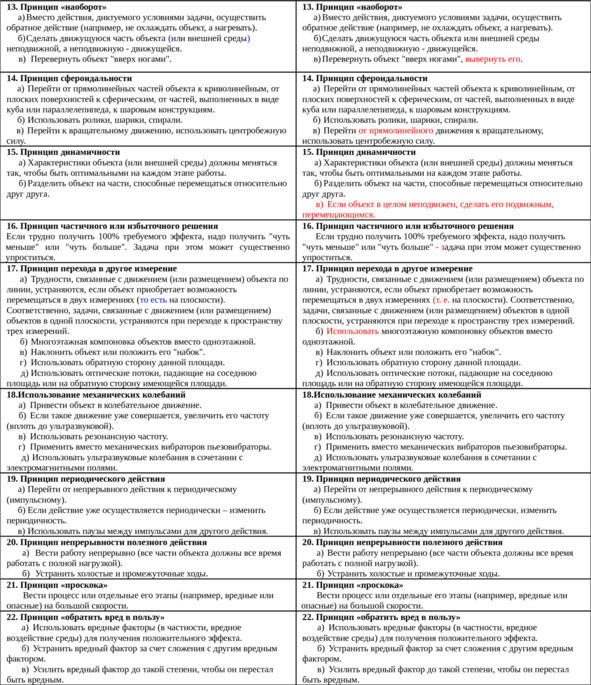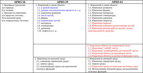 Приведены три варианта для сравнения, так как в АРИЗ-71-3 имеются варианты АРИЗ-71-1 и АРИЗ-71-2. Одинаковые тексты для трех вариантов показаны черным цветом, для АРИЗ-71-1 и АРИЗ-71-3 синим цветом, а АРИЗ-71-2 и АРИЗ-71-3 красным. Изменения в АРИЗ-71-3 выделены зеленым цветом.
