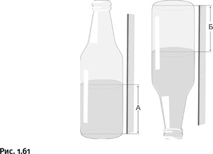 Имеется бутылка с плоским дном и сужающимся горлом, она примерно наполовину заполнена водой (рис. 1.61). С помощью линейки (с нанесенной сантиметровой шкалой) необходимо определить объем бутылки. Доливать воду или выливать нельзя. Вычислить площадь донышка бутылки не составит труда, следует измерить диаметр донышка и провести расчет по известной формуле Если бы это был стеклянный цилиндр, то осталось бы умножить площадь дна на измеренную высоту цилиндра. Трудность состоит в том, что у бутылки сужающееся горлышко. Если помещенный выше заголовок не является подсказкой и не навел вас на мысль, то рассмотрим далее решение.