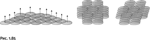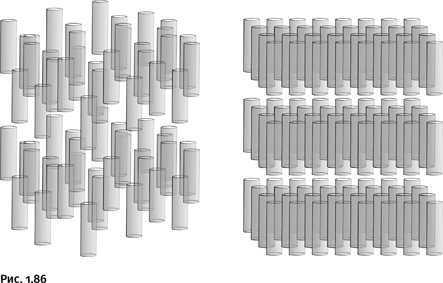 Если молекулы стержнеобразны, они могут выстраиваться параллельно друг другу, при этом начала и концы молекул находятся на разной высоте. Существует и более высокая упорядоченность оси условных цилиндров параллельны, причем их начала и концы находятся на одной высоте, т. е. довольно строго расположены, как на воинском параде (рис. 1.86).