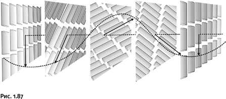 Весьма необычно размещаются молекулы в жидкокристаллической фазе упомянутого ранее холестеринбензоата. Молекулы располагаются в параллельных плоскостях, но длинные оси молекул в соседних плоскостях повернуты спирально относительно друг друга (на рис. 1.87 спиральный поворот плоскостей показан стрелками и пунктирной изогнутой линией).