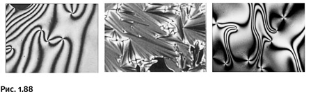 В отличие от кристаллов, где атомы или молекулы строго упорядочены по всей массе кристалла, в жидких кристаллах упорядоченные молекулы образуют агрегаты (домены), содержащие 104105 молекул. Между доменами находятся участки аморфной жидкой фазы, где молекулы расположены хаотично. Ранее было сказано, как с помощью двух поляризаторов можно обнаружить оптическую активность. Поскольку жидкокристаллические домены тоже поворачивают плоскость поляризованного света, то в поляризационном микроскопе (в нем находятся два фильтра) можно наблюдать радужно переливающиеся участки, между которыми расположены темные включения аморфная жидкая фаза (рис. 1.88).