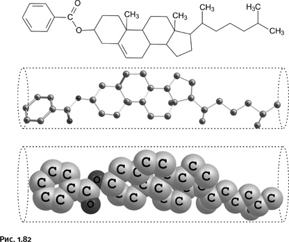 Исследования жидких кристаллов продолжались, были найдены и другие соединения, способные переходить в жидкокристаллическое состояние. В начале ХХ в. удалось сформулировать общие признаки таких соединений: их молекулы должны напоминать жесткие палочки стержни, способные укладываться параллельно друг другу. У палочкообразной молекулы длина в 34 раза больше поперечного сечения, а необходимую жесткость придают бензольные ядра и часто двойные связи. Этому требованию соответствует холестерилбензоат, с которого, собственно говоря, и началось изучение жидких кристаллов. Его структурная формула, а также пространственное строение молекулы показаны на рисунке 1.82. Поскольку структурная формула и шаростержневая модель не могут продемонстрировать палочкообразную форму молекулы, в нижней части рисунка изображена объемная модель в виде ван-дер-ваальсовых радиусов, которые показывают истинный объем, занимаемый молекулой в пространстве, т. е. с учетом электронных оболочек. Для упрощения в объемных структурах удалены атомы водорода. Чтобы подчеркнуть палочкообразную форму молекулы, объемная структура помещена внутрь воображаемого цилиндра.
