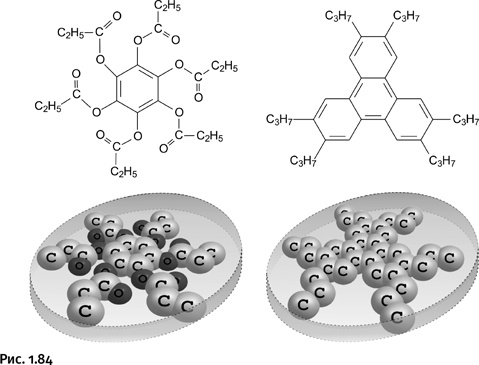 В 1977 г. индийский ученый С. Чандрасекар обнаружил, что в жидкокристаллическом состоянии могут находиться не только стержнеобразные, но и плоские молекулы с циклическими фрагментами. Молекула представляет собой объемное тело, поэтому такие структуры правильнее рассматривать не как плоские образования, а как диски, поэтому их стали называть дискообразными молекулами (рис. 1.84).
