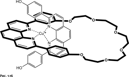 Использование катиона металла в качестве организующего центра открыло широкие возможности в синтезе катенаноподобных молекул. Вскоре Саваж получил по такой же схеме ротаксан гантель, продетую сквозь кольцо. В качестве объемистых заглушек на концах гантели были использованы крупные фрагменты порфирина это циклические молекулы, содержащие четыре атома N (рис. 1.18, верхняя структура). В 1997 г. Саваж, используя ту же стратегию, синтезировал совершенно удивительное соединение кольцевую молекулу, завязанную в узел (рис. 1.18, нижняя структура). Поскольку в состав молекулы входит четыре фрагмента фенантролина, то можно утверждать, что для получения такой молекулы необходимо задействовать два катиона меди Cu+.