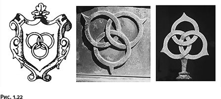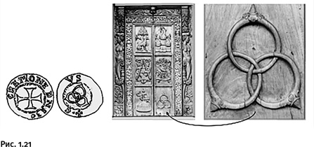 В XIV в. символ из сплетенных трех колец становится эмблемой итальянского города Кремоны (впоследствии ставшего известным благодаря тому, что в нем жил и работал знаменитый скрипичный мастер Антонио Страдивари). На одной из первых монет города изображен этот символ, означавший союз трех правящих графских фамилий. Он же был изображен на резных дверях городского храма (рис. 1.21).