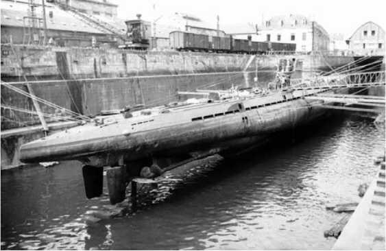 Приблизительно вот так же выглядела U 43 после подъема её со дна гавани 5 февраля 1940 года и постановки в сухой док на ремонт. На фото однотипная ей лодка U 37 в доке Лориана.