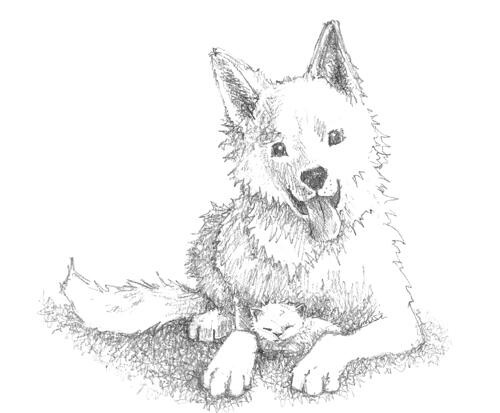 Котёнок повернул головку на звук и тихо пискнул. Хьюго наклонился и бережно взял его в зубы, прямо как мама. Малыш испугался, когда его подняли в воздух, но вскоре он очутился между крупными белыми лапами, рядом с густой шерстью пса. Он уютно устроился и на время забыл о голоде. Котёнок прижался ближе к Хьюго и задремал.