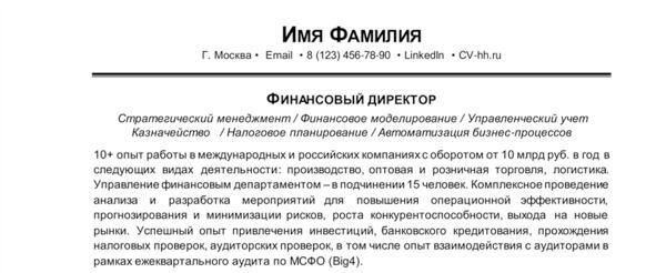 Профиль это краткое описание профессионального бэкграунда кандидата, сообщающее работодателю, что он умеет делать, какими знаниями и навыками обладает. Существуют и другие названия этого раздела: «Обо мне», «Общие сведения», «Ключевые компетенции». Он может быть оформлен в виде коротких абзацев (13), состоящий каждый из 2-3-х предложений, выделенных полужирным шрифтом или маркированным списком. Это как лид в газетной публикации, имеющий назначение дать читателю представление о содержании публикации в целом.
