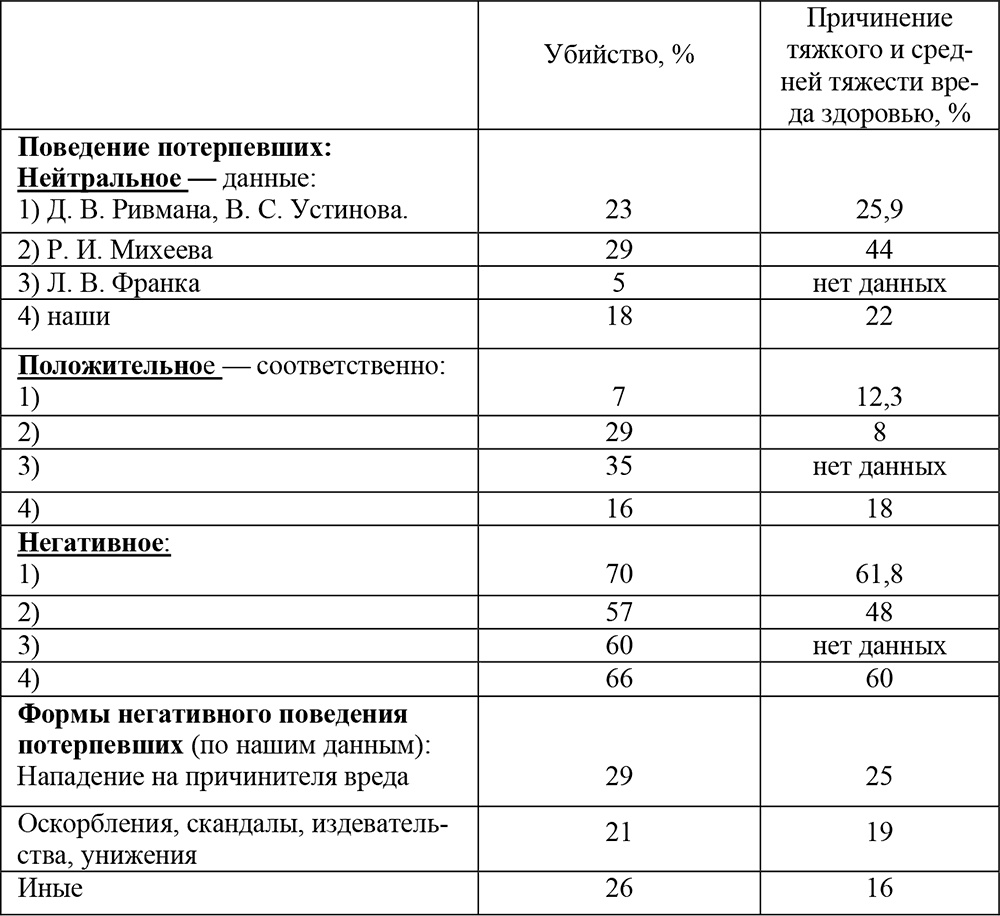 Особый научный интерес представляют те случаи, когда преступление детерминируется отрицательными качествами не преступника, а потерпевшего. Как показывает анализ уголовных дел по убийствам, причинению тяжкого или средней тяжести вреда здоровью, негативное поведение потерпевших в допреступной ситуации встречается довольно часто (см. табл. 1).