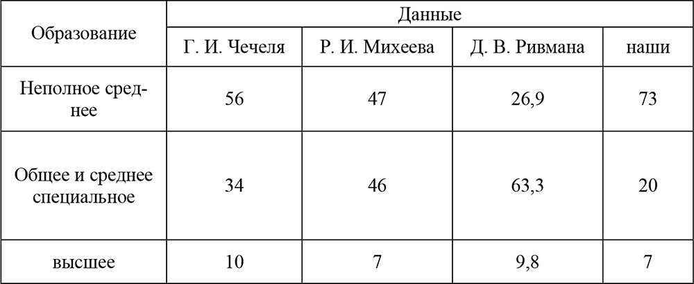 Для сравнения: если среди населения Российской Федерации доля лиц, имеющих высшее и среднее специальное образование, превышает 40 %, то среди лиц рассматриваемой нами группы она составляет 27 %.
