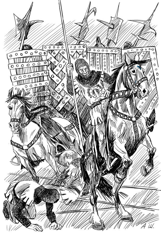 Верно, согласился Прыгун. Всё сходится. По другую сторону от нас Забытый лес, значит, это отряд безумного барона. Пора доставать наши щиты и копья. На свою беду, они нас выследили. Думаю, они постараются напасть сейчас, не дожидаясь темноты. На коне в степи везде удобная дорога, прискачут быстро. Главное не спугнуть их, пусть ударят разом, поэтому подпустим их под самые наши щиты. Если Принцесса привела нас всех сюда, значит, все и выберемся. Главное не торопиться и выжидать.