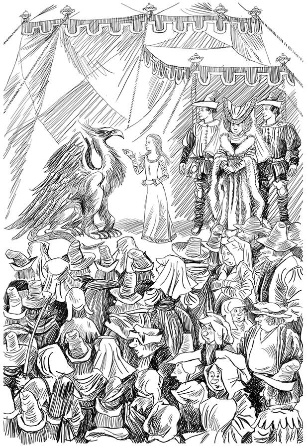 Но в конце праздника всех ожидало такое зрелище, о котором долго ещё бабушки в Редколесье рассказывали внукам. К зрителям вышел гоблин Говорун, казалось, пряча что-то под своим серебряным плащом королевского гвардейца, и объявил, что Принцесса на прощание с добрыми жителями Редколесья, собравшимися на праздник в её честь, сама хочет им показать необычное представление. Выйдя из пёстрого шатра Управительницы, девочка встала рядом с Говоруном и подняла высоко руку. И тотчас все увидели, что какая-то странная невероятная птица поднялась над крышей Охотничьего замка и, паря высоко в воздухе, приблизилась к полю и начала медленно спускаться, делая круги над Принцессой. Зрители закричали кто от удивления, кто от восторга, кто от ужаса, потому что опустившееся к Принцессе существо оказалось не птицей, а зверем. Вернее, и зверем, и птицей одновременно, с большой орлиной головой, медвежьим телом и змеиным хвостом. Подойдя к девочке, оно поклонилось, а Принцесса погладила его орлиную голову. Странное существо взмахнуло большими крыльями, взлетело вверх и медленно поплыло назад, к Охотничьему замку Управительницы.
