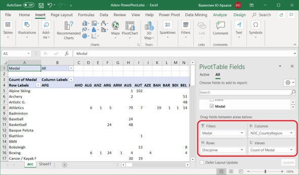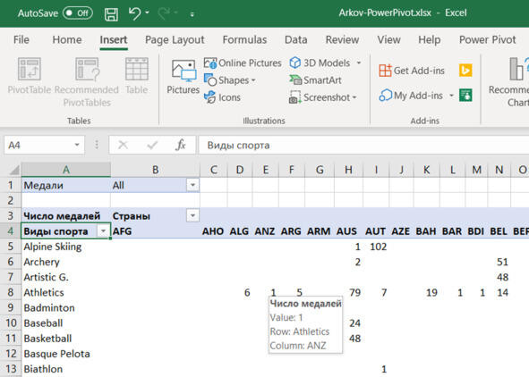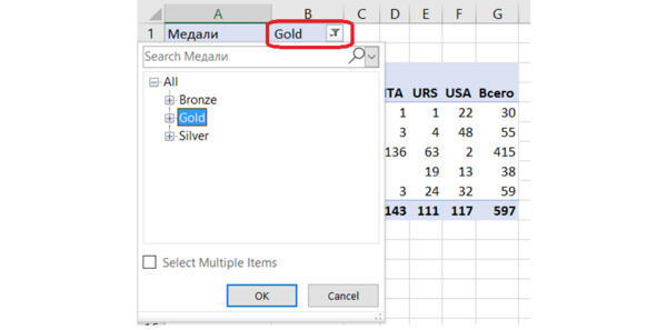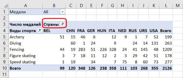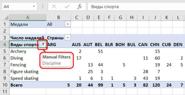 Проведём фильтрацию сводной таблицы по видам медалей.