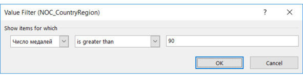 Какие же страны были отобраны после фильтрации? Можно видеть, что фильтр «Больше 90» затрагивает общее, СУММАРНОЕ КОЛИЧЕСТВО медалей по выбранным видам спорта. Другими словами, мы выбрали страны, получившие боле 90 медалей по пяти видам спорта в сумме.