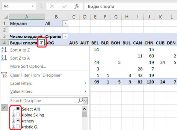 Задание. Настройте фильтрацию сводной таблицы по видам спорта.