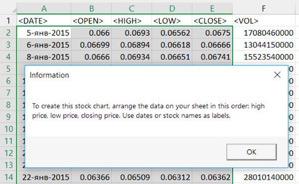 Выделяем все столбцы цен. Вызываем в верхнем меню построение биржевого графика баров: