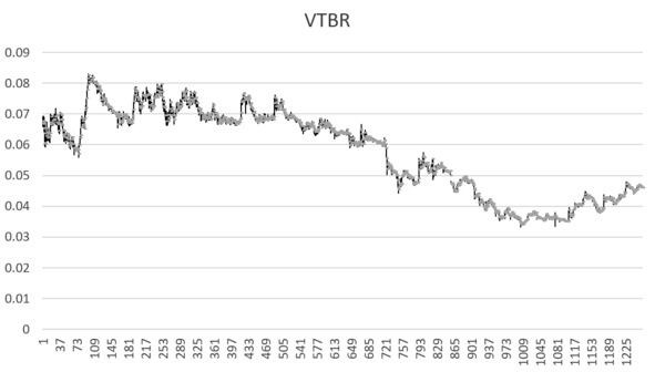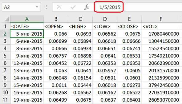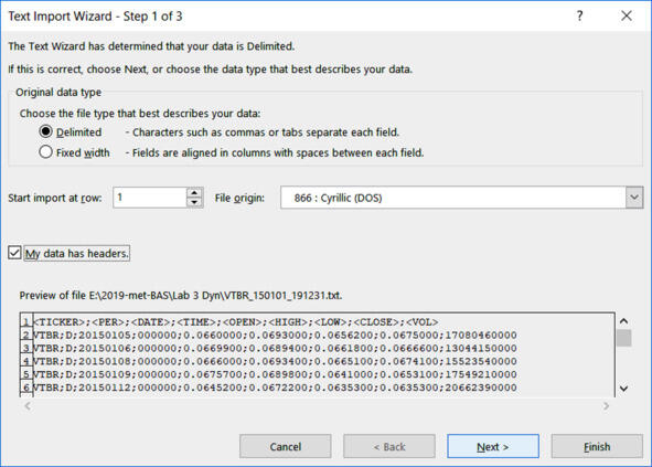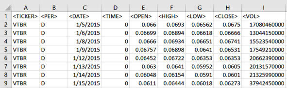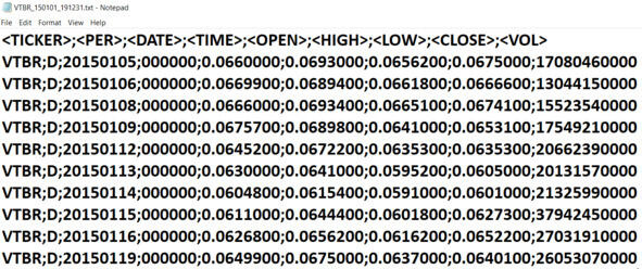 Рассмотрим полученный файл. Откроем его в приложении «Блокнот» (рис. 10.3). Первая строка содержит заголовки. Значения полей разделяются точкой с запятой. Первым указан «тикер» это условное сокращённое название финансового инструмента. В нашем примере VTBR это обыкновенные акции ВТБ (ВТБ ао). Далее указана периодичность: D означает «день» дневные данные, данные за один торговый день. Дата указана в формате ГГГГММДД (год-месяц-день). Время заполнено нулями, мы его не будем использовать. Далее идут четыре значения цены. Последнее значение объём торгов. Это количество акций, которые сменили своих владельцев за рассматриваемый торговый период.