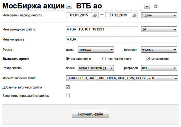 Выбираем инструмент название акции. В качестве примера загрузим дневные котировки банка ВТБ (рис. 10.2). Слово «дневные» означает, что каждая строка в таблице с данными (цены открытия, закрытия и т.д.) будет соответствовать одному торговому дню. Устанавливаем необходимые настройки и нажимаем кнопку «Получить файл».