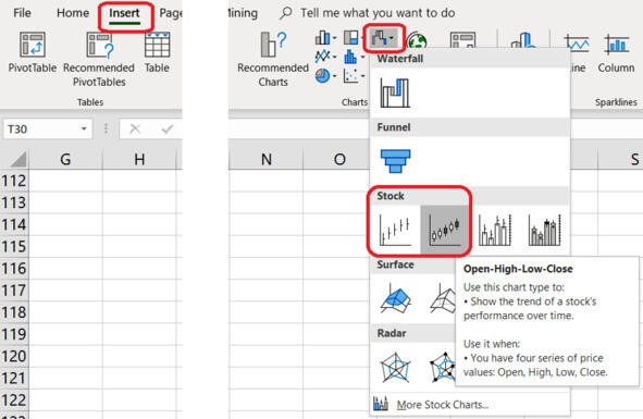 Insert Charts Insert Waterfall, Funnel, Stock, Surface or Radar Chart Stock Open-High-Low-Close