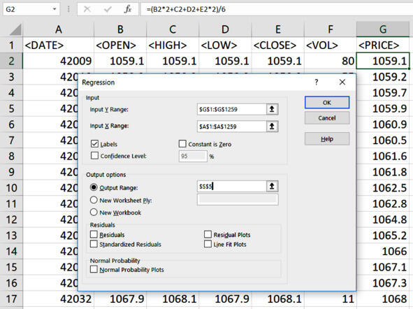 Подготовим исходные данные для регрессионного анализа. Найдём среднее взвешенное значения по четырём ценам (рис. 10.31). В этой формуле вы даём увеличенный вес ценам открытия и закрытия. В знаменателе сумма весовых коэффициентов.