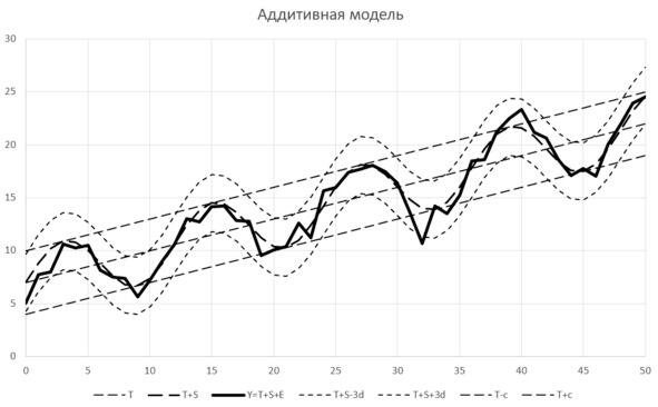 Поздравляем! Ряд динамики, сгенерированный по аддитивной модели, готов. Как видим, практически все значения после наложения случайного разброса находятся внутри наших границ «плюс-минус три сигмы».