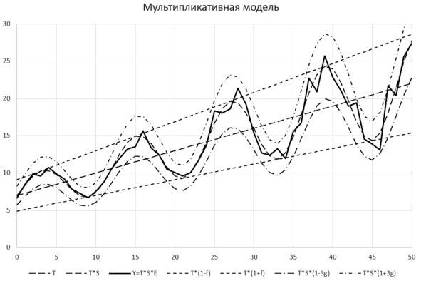 размах случайного разброса вокруг произведения тренда и колебаний;