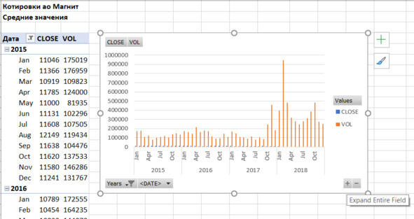 Второй показатель VOLUME. Мы взяли объёмы торгов и нашли среднее значение. Это средний объём торгов за один день. Что такое объём? Это количество акций, которые перешли из одних рук в другие за один торговый период. Может быть, они переходили от одного владельца к другому и обратно несколько раз за день. В объёмах торгов учтены все сделки. При укрупнении масштаба на биржевых графиках до месяца объёмы должны быть за месяц, а не в среднем за день. Значит, здесь должна быть сумма объёмов. Сумму в сводных таблицах мы можем посчитать.