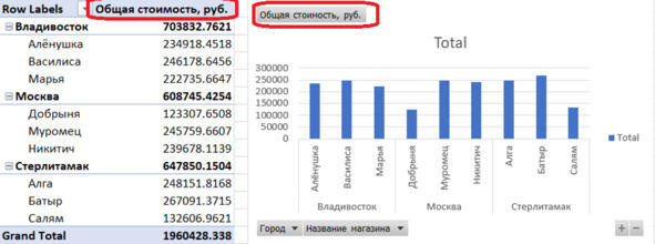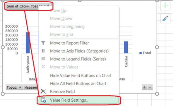 Поработаем над оформлением графика. Пока что заголовки довольно невнятные. На графике выводится общая стоимость проданных товаров. Соответственно, в левом верхнем углу мы видим название показателя: