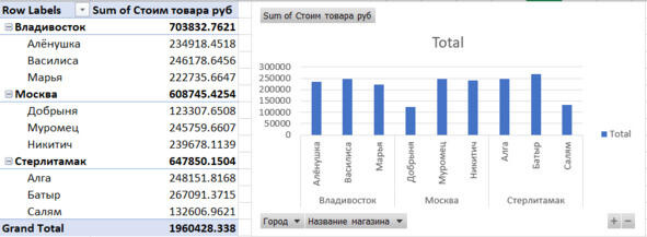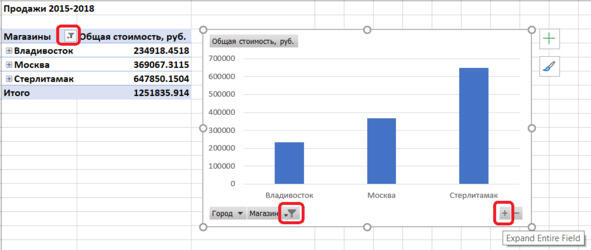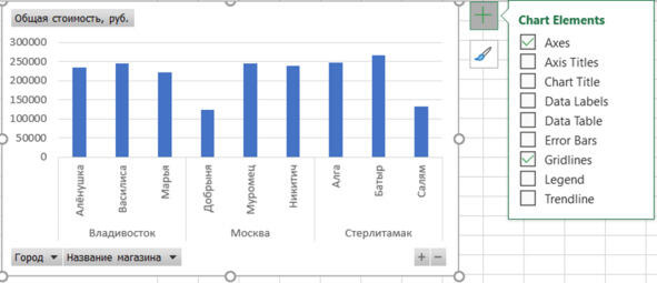 После применения фильтра по магазинам высота столбиков изменилась (рис. 12.3). Теперь некоторые данные исключены из анализа. Обратим внимание, что символ воронки (то есть фильтра) появился и на графике, и в таблице.