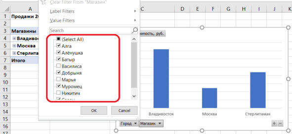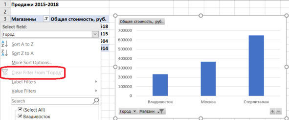 Нажмём на кнопку «Город» на нашем сводном графике. Появляется меню фильтрации (рис. 12.1). Снимаем выбор по одному городу и нажимаем ОК. На графике исчезает соответствующий столбец. В таблице пропадает соответствующая строка. Когда мы применили фильтр, на соответствующей кнопке появляется символ воронки.