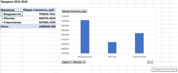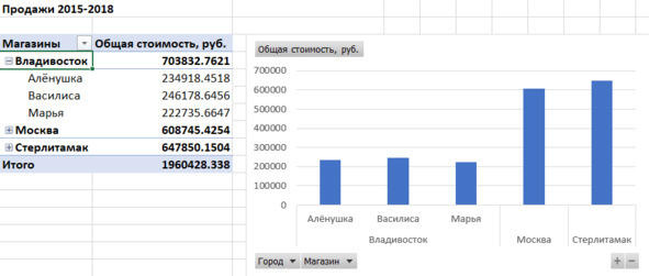 Мы можем разворачивать и сворачивать только часть таблицы и часть графика. Развернём один город в таблице (рис. 11.19). На графике тоже мы увидим более подробные сведения но только по выбранному городу. Сведения по остальным городам выводятся без детализации.