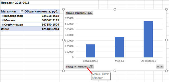 В сводных таблицах и на сводных графиках есть инструмент под названием ФИЛЬТРЫ. Это возможность исключать данные из анализа по какому-нибудь признаку. Или отбирать данные для анализа.