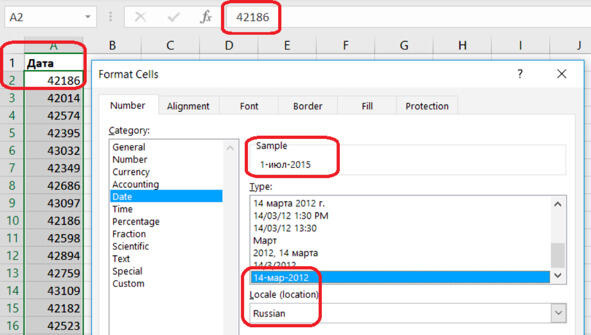 У нас остался столбец дат. Пока что в виде порядковых номеров дней. Пора вывести на экран человеческие даты. Выделяем столбец (секретная комбинация клавиш описана выше) и зададим формат даты (рис. 5.11):