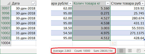 Задание. Выделите столбец количества товара в таблице транзакций и обратите внимание на показатели в строке состояния.